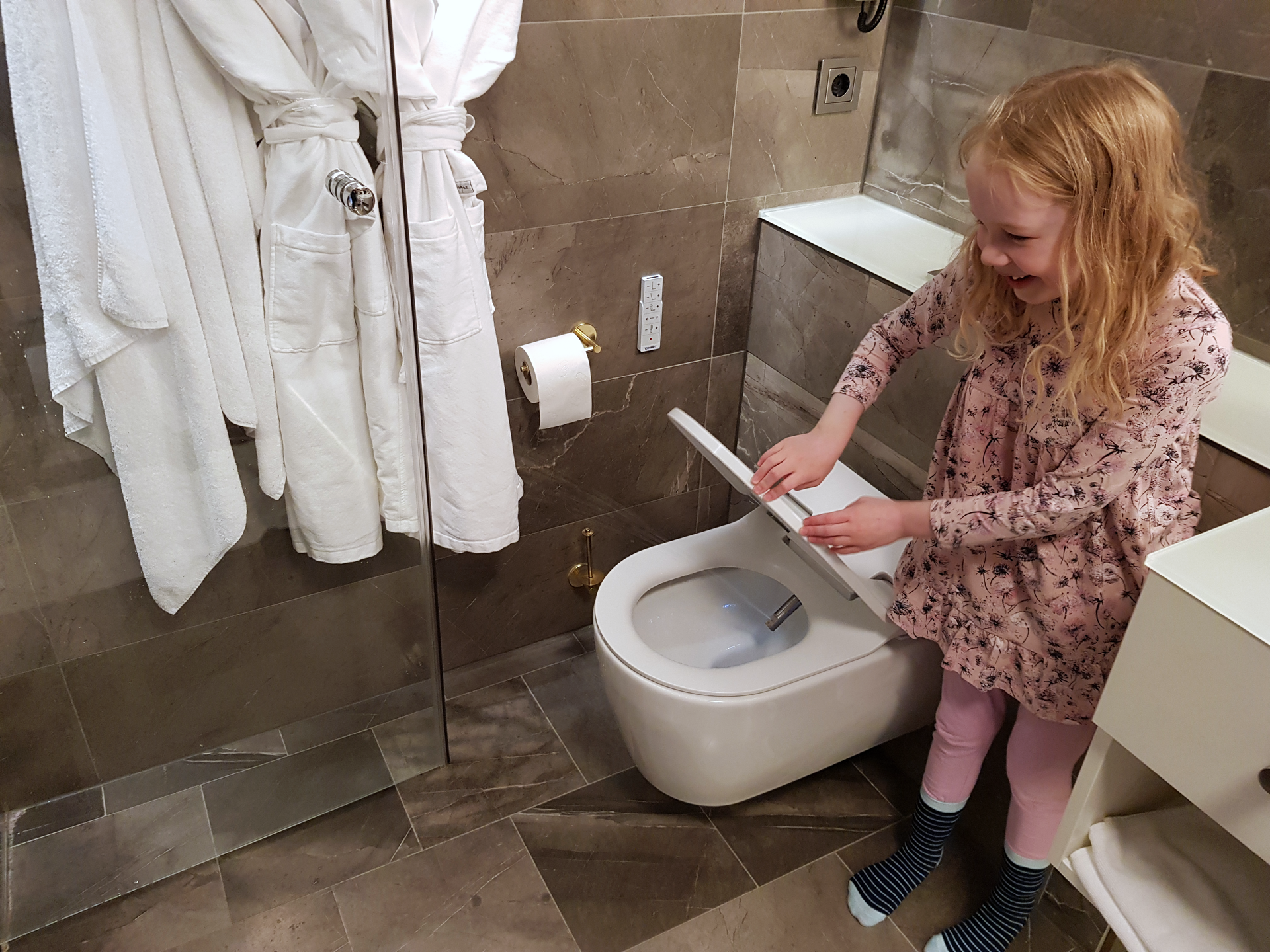 Of course we tested how far the electronic bidet at the hotel sprays water without a human butt in the way. Science answer: Really frigging far.